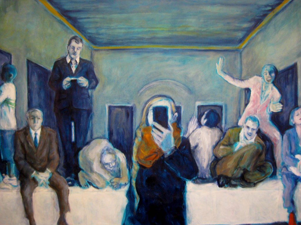 Den Anfang macht Marie-Luise Schulz mit ihrem „Abendmahl 2.0“ (Acryl auf Leinwand), sehr frei nach Leonardo: Auf dem langen, weißen Tisch sitzen, stehen, kauern, tanzen nackte und bekleidete Figuren; davor macht gerade eine Frau ein Selfie mit dem Smartphone, welches ihr Gesicht und zugleich das mittlere der drei Fenster im Hintergrund verdeckt – das Handy als Öffnung zur Welt, in dem man letztlich immer nur sich selbst erblickt? Zu diesem großen Format (150 x 300 cm) hat die Malerin mehrere Aquarelle gehängt, darunter drei sehr gelungene Portraits.