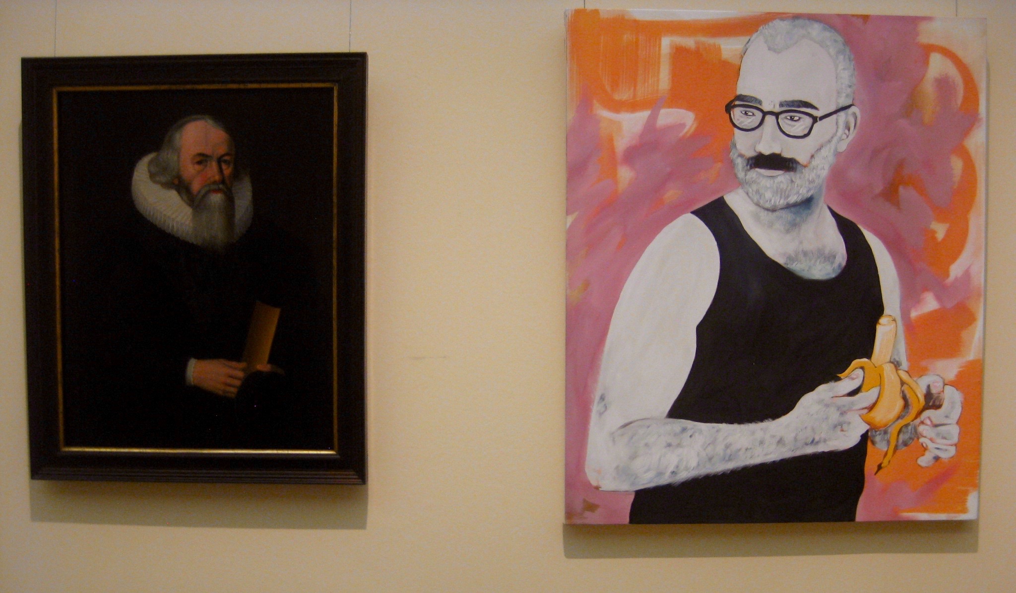 In der Gemäldegalerie konfrontiert Nils Peter Herzöge und Feldherren mit seinen markigen Männerportraits und schafft so ein ironisches Theater zum Thema Männerbild; in die ethnographische Sammlung hat er ein Selbstbildnis als Maske integriert.