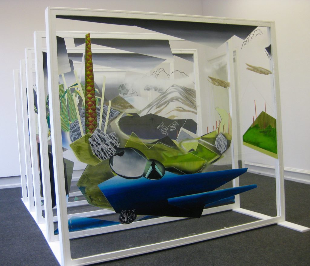 Gebirge, Meer, Himmel, Bäume und Pflanzen – eigentlich ist alles da auf dem riesigen Gemälde „Flyt“ von Anja Warzecha, das mit seinen 2,20 x 5,40 Metern einen Raum des Kunstvereins Wolfenbüttel diagonal durchmisst und ausfüllt. Und doch zögert man fast, das Bild eine Landschaft zu nennen. Die pyramidalen Berge wirken wie am Reißbrett konstruiert und dann teilweise mit Planen verhängt. Das Meer besteht aus gegeneinander versetzten Flächen in einem Azurblau, das nach oben ins Weiße ausläuft. An den Zweigen der Pflanzen reiht sich säuberlich eine Nadel an die andere, große Blätter und Palmwedel erscheinen wie aus Pappe gefaltet und angemalt. Dazwischen ragen Röhren und Stangen steif und kerzengerade in die Höhe. Sehr künstlich mutet das alles an, mit den Farben Grau, Braun, Grün, Blau auch ein bisschen kubistisch, irgendwie unwirklich und wie aus düsteren Traumbildern zusammengeschnitten. Und genau das macht die Sache spannend.