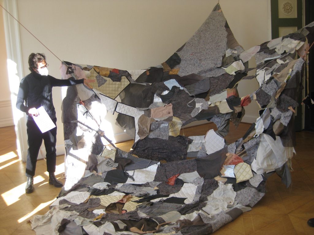 Alice Peragines (geb. 1986) textile Plastik „Soft Cover for a Soft Roader“ ist aus einer Performance hervorgegangen, bei der ein SUV im Schritttempo durch den Stadtraum von München fuhr. Die schützende Abdeckung für den Geländewagen wird nun, im Gartensaal der Villa raumfüllend ausspannt, zu einem höhlenartigen Unterschlupf für die Besucherinnen. Die Künstlerin setzt sich mit dem Verhältnis von Technologien und Körper auseinander, doch was dieses Thema mit der formal durchaus interessanten Collage aus Stoffen wie z.B. Malervlies, Airbag, LKW-Plane oder Isomattenfolie zu tun hat, leuchtet nicht unbedingt ein.